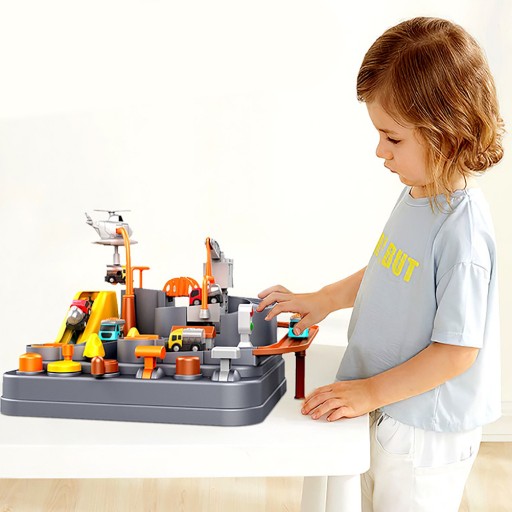 To nie jest zwykły tor samochodowy. Oferowana zjeżdżalnia posiada mechanizmy grawitacyjne oraz przekładnie i przeszkody uruchamiane ręcznie. Dziecko musi wszystko zrobić same, czyli poprowadzić mały samochodzik, tak aby pokonywać przeszkody i sprostać wszystkim wyzwaniom na trasie (np. ruchoma winda, dźwig, most).