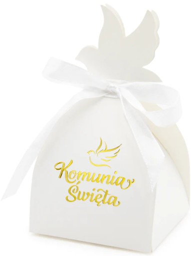 Pudełko podziękowania dla gości z motywem Komunii Świętej to idealny sposób na wyrażenie wdzięczności w wyjątkowej okazji. Na dwóch bocznych ściankach białego pudełka ekskluzywnie umieszczony został złoty napis "Komunia Święta", otoczony delikatnymi gołąbkami, symbolizującymi spokój i błogosławieństwo.