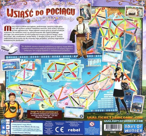 Mknij superszybkim pociągiem, podziwiając spowitą mgłą górę Fuji, lub wybierz podróż tokijskim metrem, jeśli wolisz tętniące życiem aglomeracje. A może skusisz się na cieplejsze klimaty okolic Morza Śródziemnego? Możesz bez przeszkód podróżować wzdłuż Półwyspu Apenińskiego, a gdy Ci się znudzi, wskoczyć na prom, który zabierze Cię prosto na Sycylię lub do jednego z sąsiadujących państw.Siódma odsłona bestsellerowej serii Wsiąść do Pociągu to dwustronna mapa, a więc dwa razy więcej zabawy!Kraj Kwitnącej WiśniMapa Japonii stawia graczy przed trudnym wyborem, bo niektóre trasy są zarezerwowane dla superszybiego pociągu i po utworzeniu na nich połączeń wszyscy gracze mogą z nich korzystać, aby zrealizować swoje bilety. Z drugiej strony gracze, którzy najbardziej przyczynią się do rozwoju tego projektu, zostaną nagrodzeni dodatkowymi punktami...Włoskie prowincjeTen dodatek zawiera również podzieloną na regiony mapę Włoch. Im więcej regionów połączysz, tym więcej dodatkowych punktów wpadnie na Twoje konto! Dodatkowo do gry dołącza nowy rodzaj połączeń promowych - ich budowanie będzie trudniejsze dzięki wykorzystaniu specjalnych kart Promów.