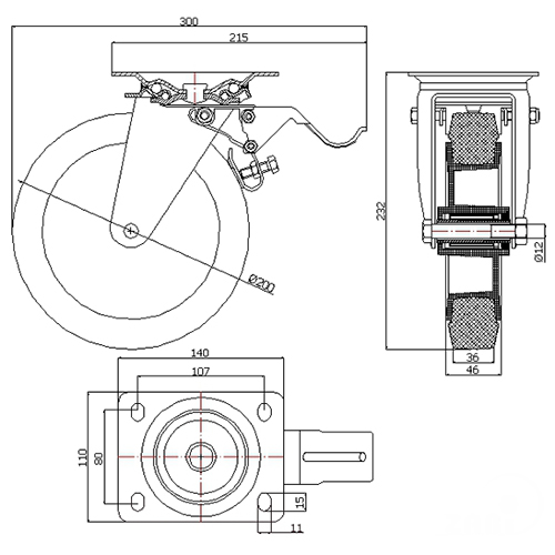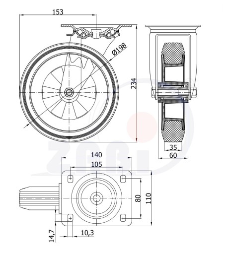 - Koło tworzywowo-gumowe w obudowie skrętnej składa się z koła z pełnymi oponami gumowymi i tworzywowymi obręczami z polipropylenu oraz ze stabilnej stalowej obudowy tłoczonej z płytką mocującą oraz hamulcem mechanicznym.