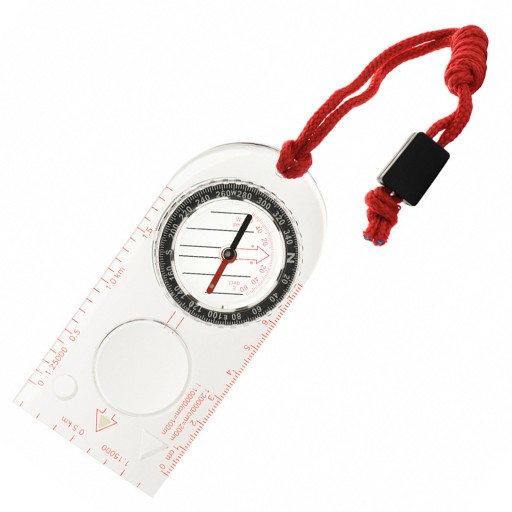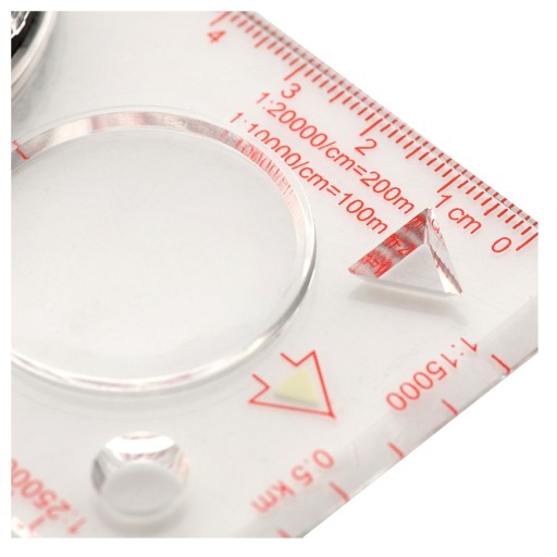 Kapsuła z cieczą i namagnesowaną igłą znajduje się na planszy kompasu, na której znajdują się dwie miarki do map o różnych skalach. I linijkę milimetrową.