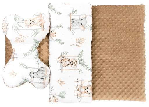 Wszystkie elementy zestawu są dwustronne, z jednej strony jest mięciutki materiał minky a z drugiej wzór bawełniany. Możemy je dowolnie układać tworząc różne warianty w zależności od potrzeb.