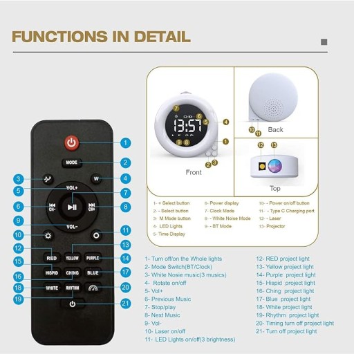 ✅ PILOT ZDALNEGO STEROWANIA: W komplecie znajduje się pilot zdalnego sterowania, który umożliwia wygodne zmienianie koloru lampy projekcyjnej, ustawianie czasu oraz budzika.