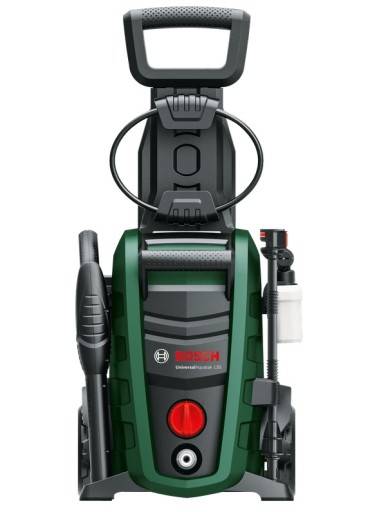 Myjka wysokociśnieniowa UniversalAquatak 135 umożliwia szybkie, wszechstronne i łatwe czyszczenie. Dysza Trio umożliwia wykonanie szeregu prac: od mycia mebli ogrodowych do czyszczenia rynien. Ustawienie strumienia wachlarzowego, obrotowego i punktowego pozwala dopasować działanie dyszy do indywidualnych wymagań każdej pracy. Oszczędź czas przy myciu samochodów dzięki wysokociśnieniowej pianownicy o pojemności 450 ml. Rozkładany uchwyt i duże koła oferują większą mobilność i łatwiejsze przechowywanie. Cichszy silnik pompy zwiększa komfort pracy. Połączenia wtykowe typu Push-fit i wygodny sposób przechowywania pistoletu natryskowego ułatwiają pracę.