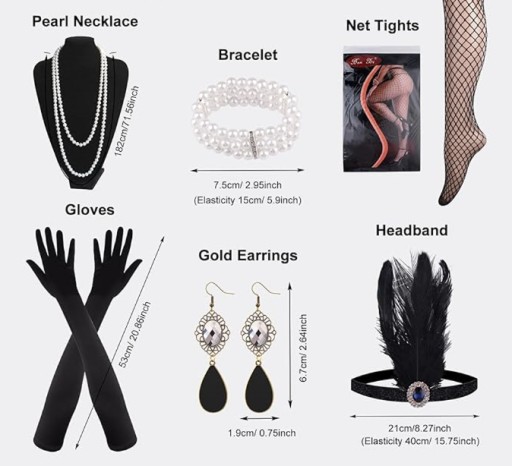 Nasz zestaw zawiera aż 9 elementów, w tym perłowe naszyjniki, bransoletki, kolczyki i wachlarz, co daje Ci pełen wachlarz możliwości, aby wyrazić swój unikalny styl retro.