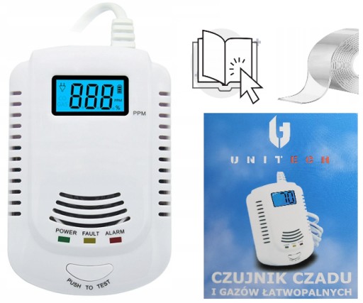 Nowoczesny certyfikowany czujnik czadu, CO i gazów palnych, LPG Popan Butan.