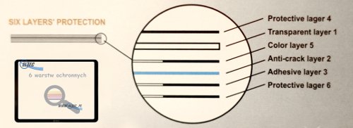 Osłony nakleja się na wyświetlacz za pomocą cieniutkich pasków klejących 3M, umiejscowionych na brzegach szybki. Jest to najtrwalszy system chronienia wyświetlacza a jednocześnie w 100% bezpieczny. Ma grubość zaledwie 0,5mm, nie odstaje od wyświetlacza, pewnie i trwale do niego przywiera.