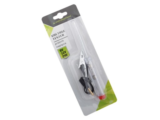 Urządzenie przeznaczone do lokalizacji napięcia w instalacjach elektrycznych samochodów z instalacjami 6/24V. Wewnątrz przeźroczystego uchwytu umieszczona jest lampka, która w momencie wykrycia napięcia zapali się. Przewód z krokodylkiem ułatwi montaż. Jest niezbędny podczas wyszukiwania awarii przewodów elektrycznych w samochodzie oraz służy do szybkiego odnajdywania braku napięcia w układach elektrycznych, bezpiecznikach lub oświetleniu.