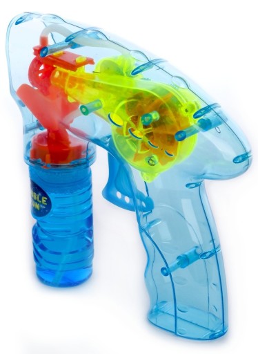 Super pistolet do produkcji bąbelków mydlanych, który po naciśnięciu na spust puszcza mnóstwo prawdziwych baniek. Wystarczy przykręcić buteleczkę z płynem do baniek, naciskać przycisk a z pistoleciku wyleci tysiące baniek.