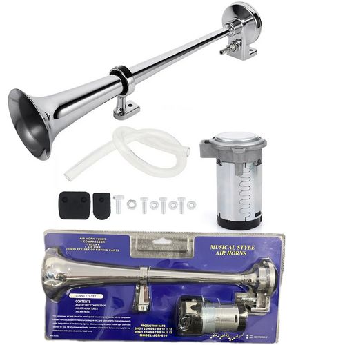 Wysokiej jakości profesjonalna, chromowana, pneumatyczna fanfara z kompresorem w zestawie, przystosowana do instalacji o napięciu 12V.