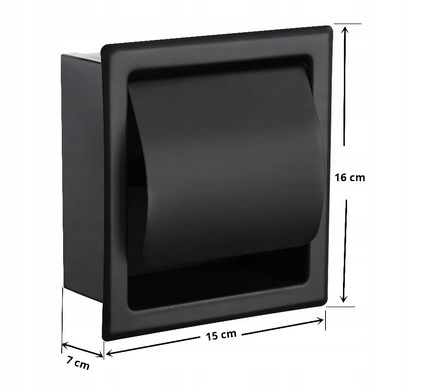UCHWYT NA PAPIER TOALETOWY DO ZABUDOWY Cechy produktu: produkt fabrycznie nowy wysoka jakość wykonania materiał: stal nierdzewna odchylana pokrywa o zaokrąglonym profilu kolor czarny wymiary podane na zdjęciu