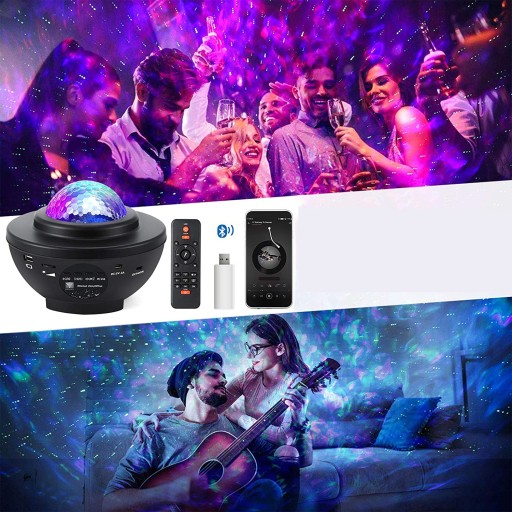 - Wbudowany mini głośnik, wystarczy połączyć się ze smartfonem lub tabletem przez Bluetooth lub włożyć dysk U. Doceń piękno rozgwieżdżonego nieba i ciesz się romantycznymi, zrelaksowanymi i wygodnymi piosenkami. Dzięki czujnikowi ruchu dźwięku projekcja może zmieniać kolor w zależności od rytmu muzyki lub klaskania w dłonie, tworząc efekt dyskoteki lub imprezy.