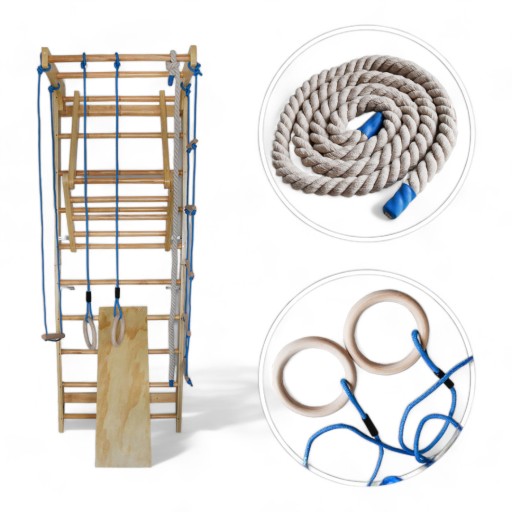 Drabinka gimnastyczna, huśtawka, kółka gimnastyczne, drabinka linowa, lina do podciągania, dodatkowy drążek, zjeżdżalnia, i komplet do montażu - wszystko, czego potrzebujesz do aktywnego spędzania czasu!