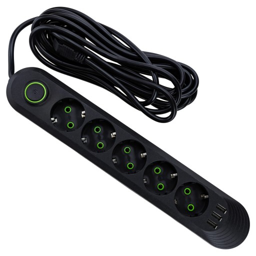 КАБЕЛЬ-УДЛИНИТЕЛЬ ДЛИНОЙ 5М, РАЗЪЕМ ПИТАНИЯ, 5 РАЗЪЕМОВ, 3 КНОПКИ ЗАЩИТЫ от перенапряжения USB.