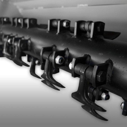 Wał rozdrabniający uzbrojony jest w 20 szt. młotków tnąco - bijakowych o kształcie łopatki, które pod wpływem wysokich obrotów ścinają i rozdrabniają materię.