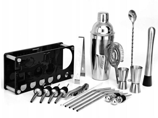 Zestaw koktajlowy zawiera wszystkie niezbędne narzędzia, zawiera 1 * Swizzle Stick, 1 * kubek 750 ml, 4 * korek do butelek, 1 * otwieracz do puszek, 1 * klips do lodu, 1 * miarka 15/30 ml, 1 * miarka 25/50 ml, 1 * Stojak na wino, 4 * rura ssąca do zginania, 1 * sitko do lodu, 1 * muddler, 2 * korek do butelki ze stali nierdzewnej, 1 * szczotka do rur ssących.