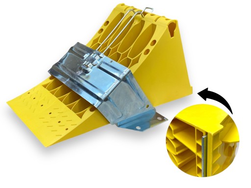 Klin pod koło z metalową podkówką / hamulcem + mocowanie
