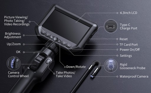 ✅Wyświetlacz LCD HD o przekątnej 4,3 cala: Kamera boroskopowa HD jest wyposażona w kolorowy wyświetlacz LCD o przekątnej 4,3 cala, umożliwiający przechwytywanie wyraźnych obrazów o rozdzielczości 2,0 MP i płynnych filmów o wysokiej rozdzielczości 1080P. Funkcja 4-krotnego zoomu pozwala na lepsze oglądanie szczegółów wewnętrznych. Wygodny w obsłudze jest gotowy do użycia po włączeniu i wyposażony w baterię o dużej pojemności 2000 mAh, która umożliwia ciągłą pracę do 3,5 godziny.