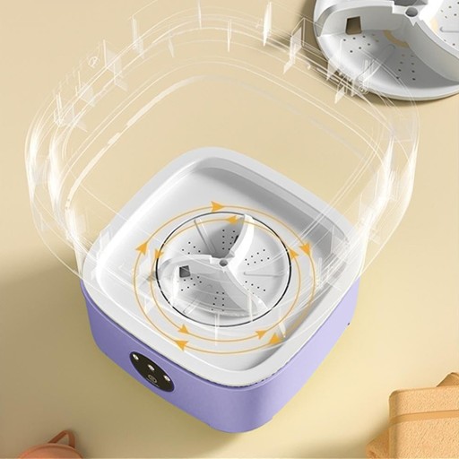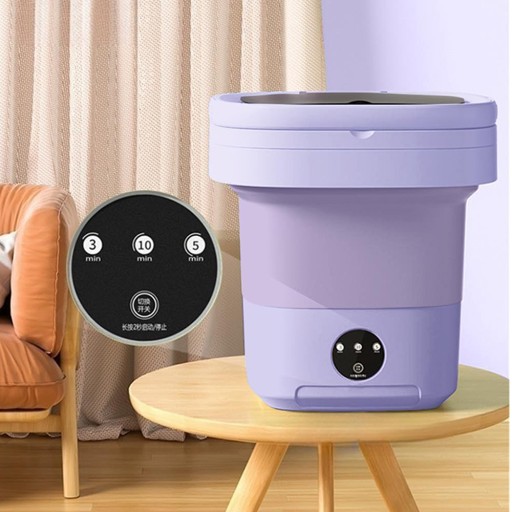 -Ta zminiaturyzowana pralka została specjalnie zaprojektowana tak, aby można ją było złożyć do małej walizki i łatwo transportować. Kiedy chcesz zrobić pranie, po prostu rozłóż pralkę i włóż ubrania do środka.