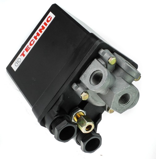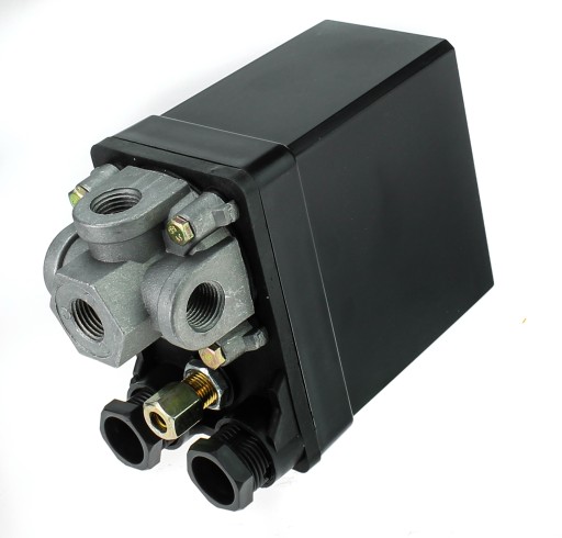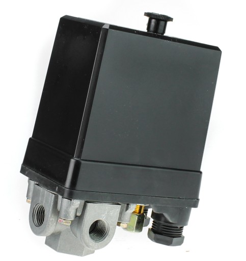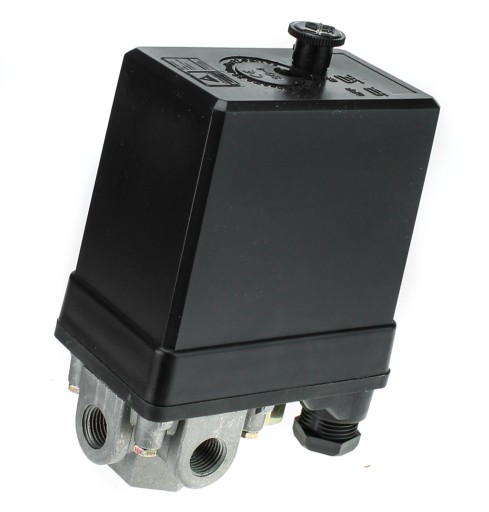 Wyłącznik ciśnieniowy jest niezbędnym elementem kompresora, który ma za zadanie kontrolować i regulować ciśnienie w instalacji. Presostat wykonuje funkcję automatycznego wyłączania i włączania kompresora w zależności od ustawionych parametrów ciśnienia. Posiada możliwość regulacji ciśnienia załączaniA i wyłączania w zakresie 3-12 Bar.