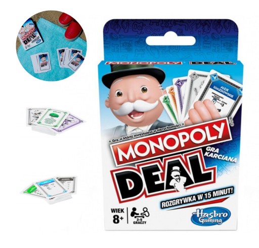 Gra Monopoly Deal.Witaj w świecie Monopoly Deal, gdzie reguły znane z oryginalnej gry Monopoly połączono z dynamiką gry w karty. Nowy wygląd oraz skondensowane zasady gry pozwolą wam rozegrać partię Monopoly Deal nawet w 15 minut. Zbieraj karty Własności, korzystaj z kart Akcji, aby zmusić pozostałych graczy do spłaty czynszu i dobijaj targu. Gracz, który jako pierwszy zbierze 3 pełne Zestawy Nieruchomości w różnych kolorach - wygrywa!