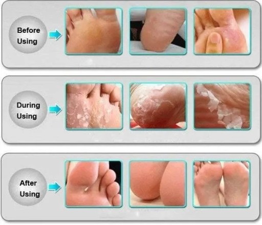 Podczas stosowania kuracji, stopy będą wyglądać nieestetycznie, ze względu na mocno łuszczącą się skórę - jest to naturalny efekt, oznaczający, że kuracja jest skuteczna - proces jest całkowicie BEZBOLESNY, a już po 7-10 dniach skóra stanie się wyjątkowo gładka i zdrowa jak u dziecka!