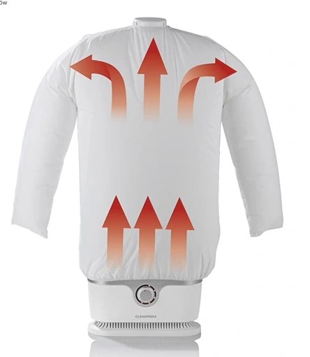 Wystarczy przeciągnąć koszulę lub t-shirt na korpus balonu prasownicy "CLEANmaxx" i zamocować za pomocą dołączonych zacisków. Następnie ustawić timer na żądany czas, a korpus balonu nadmuchuje się i jednocześnie oddaje ciepło do ubrania. W ten sposób np. np. koszulka w ciągu kilku minut znacznie delikatniejsza niż w suszarce bębnowej i wygładzona prawie bez zagnieceń.
