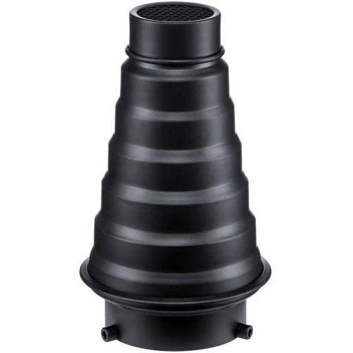 Mocowanie Bowens Ta wersja urządzenia jest dostępna z mocowaniem Bowens. Sam snoot rzuca skupione światło na obiekt, a dodatkowy plaster miodu na końcu jeszcze mocniej ogranicza rozprzestrzenianie się światła na boki.