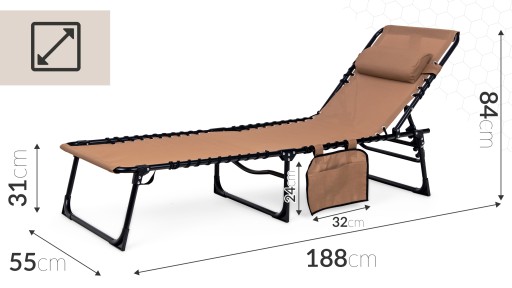 - Dzięki dołączonej torbie w kolorze leżaka możliwe jest przechowywanie telefonu, przekąsek, ulubionych gazet i książek w zasięgu ręki.