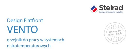 Wszystkie elementy grzejników VENTO są wbudowane, dzięki czemu grzejniki zachowują klasyczny wygląd. Design Flatfront • VENTO z sześcioma punktami montażowymi daje możliwość nowoczesnego dyskretnego podłączenia dolnego grzejnika ale również tradycyjnego bocznego. Wykończony jest gładkim panelem przednim. Design Flatfront • VENTO jest minimalistyczny i elegancki ale przy tym jest ozdobą wnętrza. Vento dostępny jest w typie 22, w dziewięciu wariantach szerokości (500 - 2000 mm) i trzech wariantach wysokości (400, 600 i 900 mm).