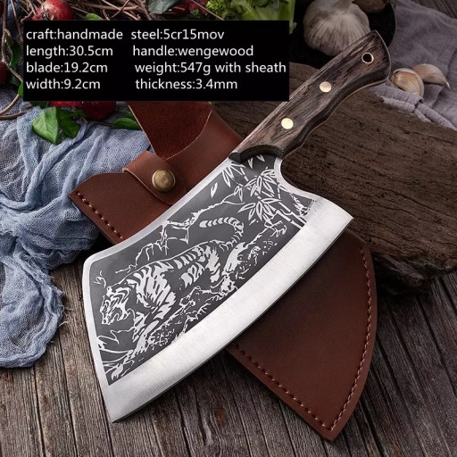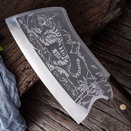 Wysokiej jakości tasak kuchenny z nadrukiem tygrysa w niesamowitej cenie! W strukturze materiału występuje naprzemiennie kilka warstw różnych rodzajów stali. Warstwy te łączy się metodą zgrzewania kowalskiego w jedną całość.Podczas użytkowania należy wziąć pod uwagę, że nóż jest bardzo ostry i służy do krojenia żywności. Zalecamy umycie, wysuszenie i odłożenie noża bezpośrednio po użyciu. Zaletami noży z tej serii jest niezwykła ostrość i twardość (HRC57±2).