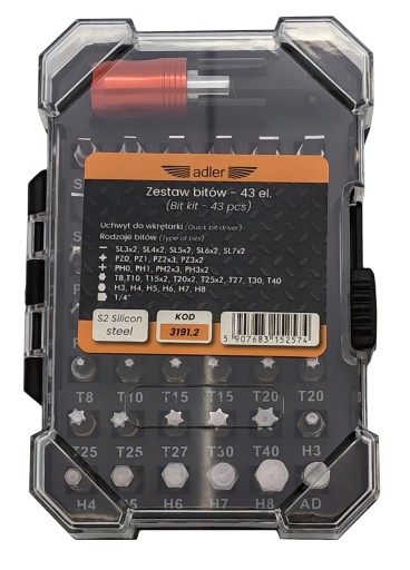 Bity Torx: T8 x 1szt, T10 x 1szt, T15 x 2szt, T20 x 2szt, T25 x 2szt, T27x1szt, T30 x 1szt, T40 x 1szt