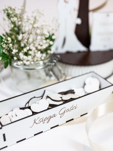 Do podziękowania dołączone jest białe drewniane grawerowane pudełko z miejscem na pisak oraz 80 szt serc (30 szt o średnicy 4,5 cm oraz 50 szt o średnicy 3,5 cm), na których goście mogą się podpisać.