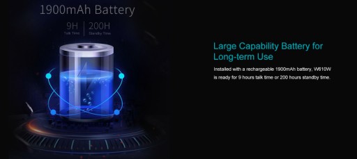 Wbudowany akumulator telefonu 1900mAh pozwala na pracę do 9 godzin rozmów i nawet 200 godzin w trybie czuwania.
