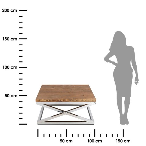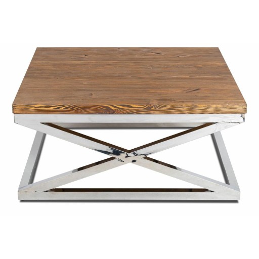 Elegancki sześcienny kawowy stolik, będący rewelacyjnym uzupełnieniem każdego wnętrza, w szczególności w stylach glamour, nowojorskim, czy nowoczesnym. Blat wykonany został z naturalnego drewna, a podstawa ze stali nierdzewnej w kolorze srebrnym. Solidne wykonanie zapewni długoletnie użytkowanie.