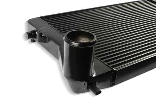 Intercooler FMIC Black Edition o wymiarach rdzenia: 610x420x55mm, ze średnicą wlot/wylot 70mm, z powodzeniem stosowany w mocnych autach, często przekraczających 500KM. Posiada bardzo wydajny, zarówno zewnętrzny, jak i wewnętrzny rdzeń nowego typu o unikanym ułożeniu lamelek, co gwarantuje lepsze chłodzenie w porównaniu do podobnych produktów innych producentów, zachowując jednocześnie znakomite przepływu powietrza. Grube ścianki wykonane z najwyższej jakości aluminium zapewniają ogromną wytrzymałość IC. Znakomicie zastępuje seryjny intercooler zwiększając osiągi samochodu.