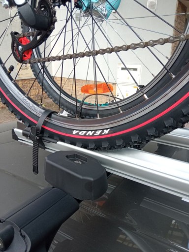 Dzięki głębokiej pryzmie podkładce pod koło ułatwia montaż, rower również zachowuje się stabilniej podczas montażu i jazdy samochodem. Mocna konstrukcja zapewnia stabilność i bezpieczeństwo. W zestawie znajdują się dwa paski mocujące koła roweru.
