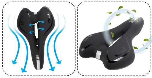 - Powierzchnia siodełka rowerowego jest wykonana z materiału zapobiegającego nadmierną potliwość i wkładu żelowego, który zapewnia wygodną i miękką jazdę. Zapewnia również odpowienie wsparcie dla kości pośladkochych, ogonowych i kręgosłupa