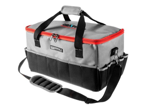 Wytrzymała torba na elektronarzędzia GRAPHITE Energy+ o pojemności 24 l. Wykonana z materiału o gęstym splocie, zapewniającym wysoką odporność na przecieranie. Laminowany od wewnątrz materiał poliestrowy chroni zawartość torby przed wilgocią i niekorzystnymi warunkami atmosferycznymi. Torba posiada 14 kieszeni zewnętrznych, 7 pojemnych kieszeni wewnętrznych oraz 14 zaczepów na narzędzia.