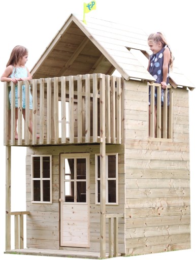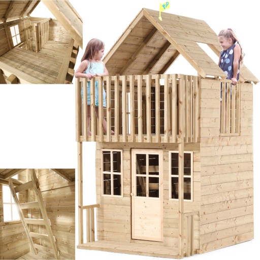 Na obu poziomach domku znajdują się obszerne werandy, gdzie można cieszyć się przyjemną pogodą i pięknym widokiem na otaczający ogród. Wewnętrzna drabinka prowadzi na górny poziom, gdzie dzieci mogą korzystać z dodatkowej przestrzeni do zabawy lub relaksu. Na piętrze znajduje się balkon z możliwością demontażu barierki, aby zainstalować zjeżdżalnię. (zjeżdżalnia sprzedawana oddzielnie)