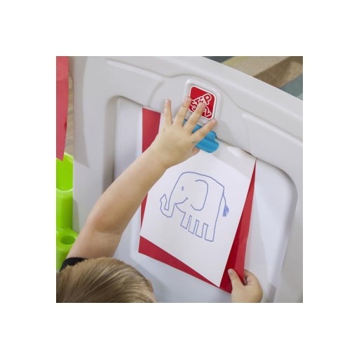 Wielkie centrum małego artysty będzie spełnieniem marzeń każdego dziecka. W zestawie znajdziemy biurko z siedziskiem, schowki, półki, pojemniki na wszystkie akcesoria i przybory malarza, tablice kredową, dwie sztalugi z klipsami - jedną większą, przy której dziecko może malować (i po której można pisać mazakami) i jedną mniejszą, która może umożliwić ekspozycję prac. Ze względu na rozmiary, z centrum może korzystać równocześnie więcej niż jedno dziecko, co dodatkowo pozytywnie wpływa na rozwój maluchów.