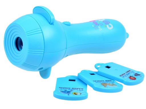 Zestaw zawiera: – latarka do wyświetlania slajdów – cztery obrazki z kolorowymi wizerunkami zwierząt typu: słoń, zebra, lew, skunks, sarenka, tygrys, biedronka, pszczółka, ślimak, rybki ect.)