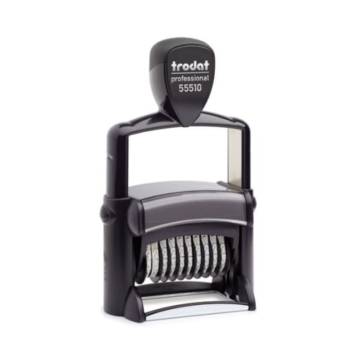 Numerator Trodat Professional 55510. Ilość cyfr 10, wysokość czcionki 5 mm. Maksymalny wymiar płytki tesktowej to 56 x 33 MM.