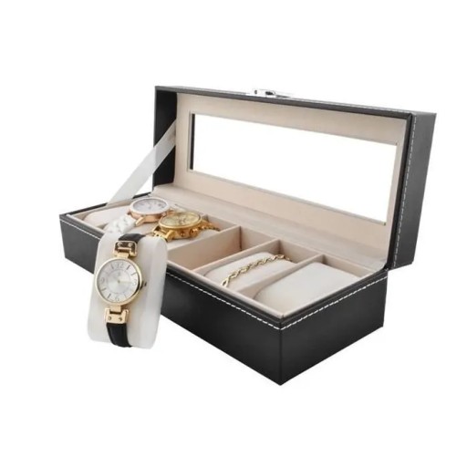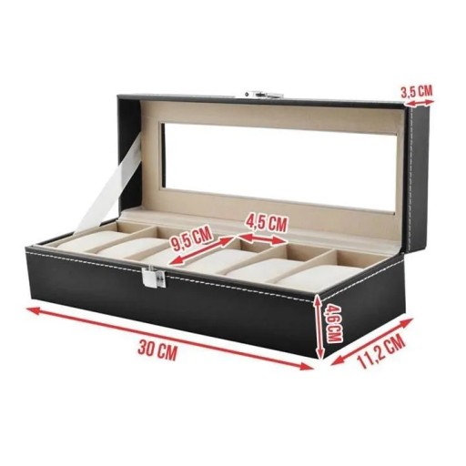 Eleganckie pudełko na zegarki posiada aż 6 przegródek, w których można umieścić nie tylko zegarki, ale również inną biżuterię. Kasetka ma elegancki, czarny kolor i widoczne jaśniejsze szwy, co dodaje całości elegancji i stylu. Wieczko etui na zegarki jest przezroczyste (szyba akrylowa), dzięki czemu pudełko na zegarki możemy wykorzystać nie tylko do przechowywania, ale również do eleganckiego eksponowania zawartości.