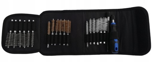 Zestaw szczotek do gniazd wtryskiwaczy, gniazd świec iskrowych i żarowych. W komplecie jest przedłużka i uchwyt. 18 szczotek do czyszczenia o rożnej twardości. Szczotki nadają się również do użytku w wiertarkach elektrycznych i pneumatycznych. Wszystkie szczotki z napędem 1/4".