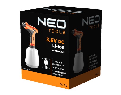 Opryskiwacz akumulatorowy micro-USB 3.6V, Napięcie akumulatora: 3,7V, Pojemność akumulatora: 2000mAh, Ładowanie: USB, Czas ładowania: 3h, Jedno ładowanie pozwala na 60 min ciągłej pracy, Zasięg: max 6 m, Ciśnienie robocze max 2.41 bar, Wydajność 280 460 ml/min, Pojemność zbiornika 1 L, Temp. pracy: 0-40 st.C, Możliwość ustawienia siły od mgiełki do silnego strumienia punktowego