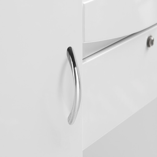 Recepcja jest zaprojektowana w taki sposób, by stanowić jak najbardziej pojemny i praktyczny element umeblowania. Dla wygody korzystania została wyposażona w: trzy różnego rozmiaru otwarte półki, jedną półkę wysuwaną, szufladę zamykaną na klucz oraz dwie zamykane szafki z estetycznymi uchwytami w odcieniach srebra. Przestrzenie zostały rozplanowane w taki sposób, by jak najbardziej ułatwić organizację oraz zachowanie porządku w miejscu, w którym zgromadzone są wszystkie ważne dokumenty.