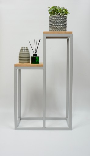 Kwietnik loft - jasnoszary, satynowy. Kwietnik z dwiema półkami fornirowanymi w kolorze jasny dąb. Doskonała ekspozycja dla kwiatów doniczkowych, kwiatów świeżych w wazonie lub innych dekoracji. Sprawdzi się zarówno w salonie jak i w ogrodzie. Malowany proszkowo - odporny na czynniki zewnętrzne, pokryty powłoką antykorozyjną.