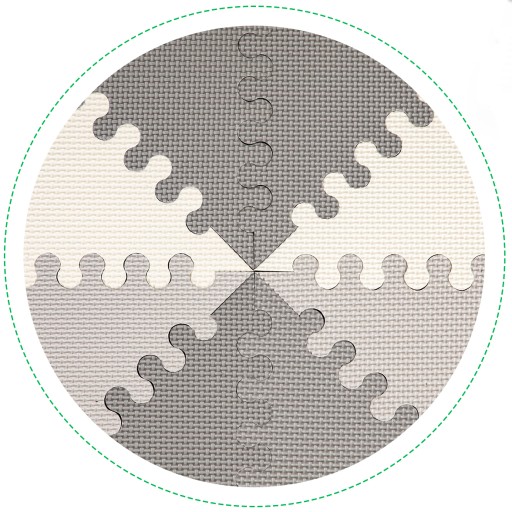 - Mata składa się trójkątów, których brzegi posiadają specjalne "ząbki", dzięki którym można je łączyć w dowolny sposób. Grubość maty ( 0,9 cm ) zapewnia odpowiednią ochronę przy upadku i sprawia, że jest przyjemnie miękka.
