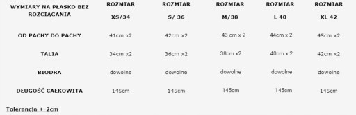 - Poniżej tabelka z wymiarami, sukienka jest elastyczna jedynie górą, od pasa w dół się nie rozciąga.